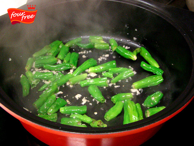 꽈리고추와 멸치를 볶을 때 꽈리고추를 먼저 익혀야합니다 그래야 살캉하지 않고 부드럽습니다 팬에 식용유를 살짝 두르고 다진 마늘을 넣어 볶다가꽈리고추를 넣고 물 12컵을 부어 뚜껑을 닫고 잠시 익혀줍니다...
