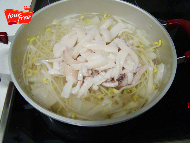 냄비에 물 6컵 정도 붓고 나박 썬 무를 한 줌 넣어다시마 3장과 함께 끓이기 시작끓기 시작하면 다시마를 건져내고 무가 푹 무르게 익으면콩나물을 한 줌 넣어줍니다 약 3분 정도 끓인 다음 오징어 한 마리를 썰어�...