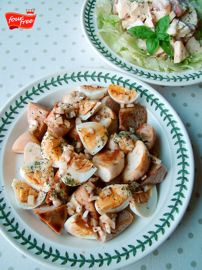 베이글은 한 입 크기로 썰었습니다 후라이팬에 올리브유를 두르고 노릇하게 구웠어요삶은 계란 3개를 자르고풀무원 발사믹올리브 소스에 양파 14개 다져넣어 소스를 준비재료를 접시에 담고 먹기 직전에 뿌려먹...