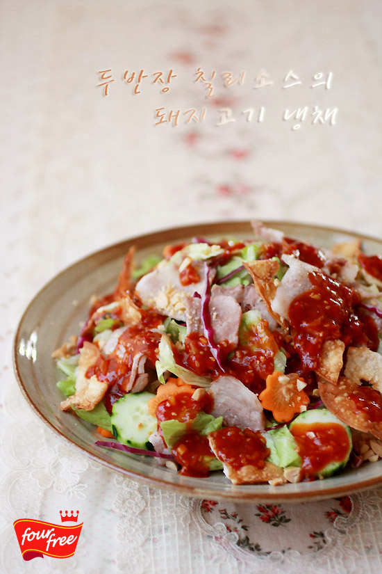 두반장 칠리소스의 돼지고기 냉채입니다돼지고기를 밑간해서 찜기에 쪄서 기름기를 쫙 뺀 다음샐러드 채소와 함께 매콤달콤한 두반장 칠리소스를 뿌렸어요돼지고기의 단백질과 비타민과 채소그리고 매콤한 두...