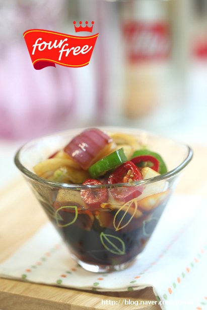 야채즉석장아찌재료 오이 1개160그람 아삭이고추 2개 홍고추 1개 양파 05개 월계수잎 1장오이양파 절일때 물 2컵 식초 2큰술 소금 1작은술장물 멸치다시마물 04컵 간장 05컵 맛술 4큰술 물엿식초 2큰술 설탕 05큰술 고�...