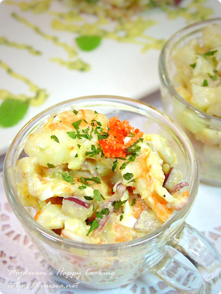 찜통에서 대하찜을 만들려다가 실패해서 탄생한 새우샐러드랍니다대하를 등쪽으로 갈라 찜통에서 찐 후에삶은 계란과 날치알로 장식하려던 것이었는데요찜통에서 너무 오래 찌는 바람에 새우형태가 다 쭈굴쭈...