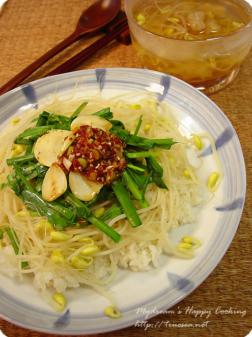 콩나물부추비빔밥 한그릇밥이랍니다마늘을 편으로 썰어 포도씨유에 살짝 튀기듯 익혀주었구요부추는 깨끗히 씻어서 적당히 썰어 마늘을 구운 팬에 넣고약 30초 정도만 살짝 익혀주었어요 소금과 후춧가루 살짝 ...