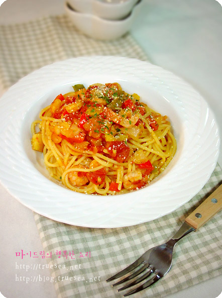 오후에 외출했다가 조금 늦게 집에 들어왔어요밥통에 밥은 하나도 없고마음이 급해지기 시작했지요이럴때 비상대책식단으로 스파게티가 딱 떠오르는거에요토마토소스 한 병 있겠다 스파게티면 있겠다냉동실�...
