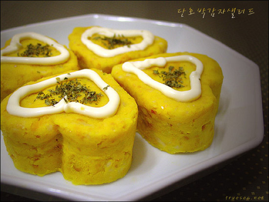 단호박을전자렌지에서 익힌 다음껍질에 붙어있는 단호박을 긁어서는감자 1개를 쪄서 샐러드를 만들어 하트모양틀에 넣어 모양을 내보았어요감자 큰 것 1개 단호박은 색을 낼정도만 아주 조금3스정도 땅콩가루 �...