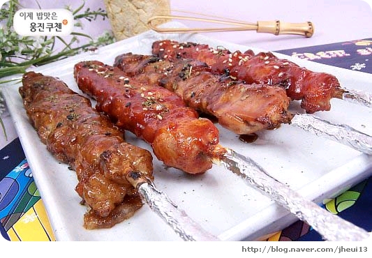 닭꼬치재료 꼬치에 꿰인닭 20cm꼬치길이는 25cm정도 4개 통깨나 파슬리가루 약간닭꼬치 밑간 맛술 3큰술 소금 후춧가루 약간데리야키소스 간장 4큰술 다시마물 6큰술or 물 청주와 맛술 3큰술씩 조청 212큰술설탕 112...