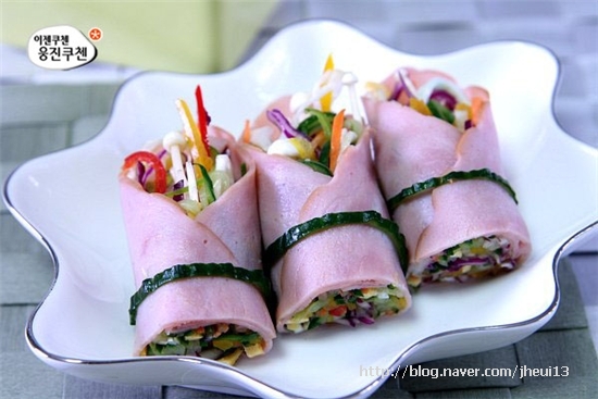 햄야채말이재료 슬라이스 사각햄 5장 당근오이파프리카계란풋고추팽이버섯양배추적채지단등의 채썬것 크게한줌슬라이스햄오이등 초절임물 생수 12컵 설탕과 식초 1큰술씩 소금 14작은술참깨땅콩버터소스 참�...