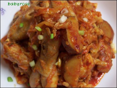 매운닭다리찜매운닭다리찜4인분재료 닭다리 45쪽 양배추 100그람 양파 12개 청량고추 2개 붉은고추 12개닭육수 112컵 향신기름 적당량닭다리삶을물 물 3컵 청주 2큰술매운양념 진간장 312큰술 굴소스 1큰술 설탕 112...