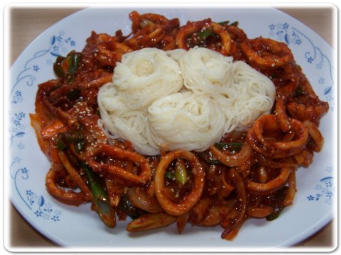 올만에 골벵이무침과 소면이 아닌오징어볶음과 소면입니다비싼 골뱅이 까불지 말라 하쇼데친 오징어와 풋고추 당근 양파 파 이렇게 준비 했구요전 갠적으로 질척한 볶음이 싫어서 오징어를 데쳐서 요리합니다�...
