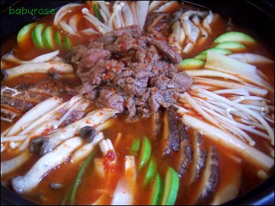 칼칼한 국물맛이 개운한 매운버섯전골 이예요주재료 쇠고기불고깃감100그람 데친느타리 100그람표고버섯 60그람중간크기로 3개 팽이버섯 1봉지분량 풋고추 1개붉은고추 1개 호박 14개 양파 12개 대파 12대부재료 �...