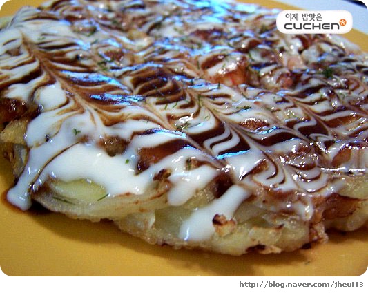 오사카식 오꼬노미야키15cm 팬 2장분재료 부침가루 1컵100그람 다시마물이나 가다랭이육수 180ml 갈은마 2큰술분 베이킹파우더 12작은술 채썬양배추 90그람 채썬양파 60그람12개 중 계란 1개65그람 부침기름 적당량올�...