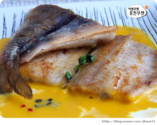 단호박 소스를 얹은 임연수어 구이재료 임연수어 1마리중 녹말가루 2큰술 카레가루 1작은술임연수어 밑간 청주 1큰술 약간의 소금과 흰 후춧가루단호박 소스 단호박 100그람썰은것 반줌정도 안썰은 것으로 손바...